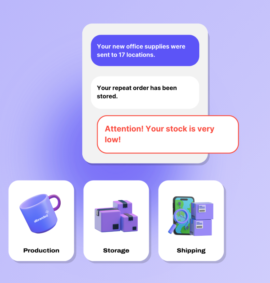 We produce your items. Track and manage your stock of office and promotional items in real-time. No more frantic reorders or manual promotional items are always available - without any manual processes.